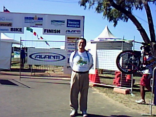 ふうさん バイクゴールを前に。 なんとかアイアンマンのバイクを6時間台でゴールしたい。 後ろはアイアンマンビレッジ本部。 巨大なテントが林立している。