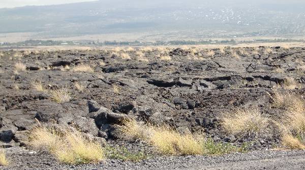 荒涼とした溶岩台地。猫じゃらしが枯れたような草が生えている。この草は硬く、弱い風では揺れない。これが揺れているときは結構強い風。