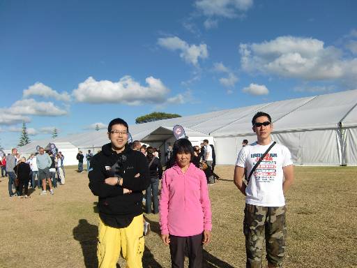 カーボパーティ会場入り口で。向かって左は梅澤さん、右は竹内さん。 真ん中で中坊のように見えるのがマッキー 肉類はあまりうけつけず、ジャガイモ、キャベツ、パスタを食べる。 マッキーはもりもり食べている。ようやく機嫌もなおったようだ。 最高齢出場者であり、エイジのワールドチャンピオンとして小島さんが紹介される。 パーティが終わったあとは、引き続き競技説明会。 ドラフティングゾーンが7mから12mに延長になった。 これが一番大きな改正点だった。 間に4台バイク間隔から7台バイク間隔に延長。 レース当日、マーシャルは容赦なくイエローカードを出しまくっていた。 イエローカードを出されるとペナルティボックスに4分間入らなければならない。 それも自分で申告して入る。 他には特記すべきことは無かったように思った。まっすぐ帰って、早めに寝た。 12月4日土曜日 レース前日。バイクと、バイク・ラン用品の預託。 バイクをもう一度点検して、数百メートル最後のためし乗りをする。 ポジションと整備はOK。 昨日の昼夕と軽いもので済ませて胃腸を休ませたのでお腹の調子が少し戻ってきた。 Gooseにいって昼食。