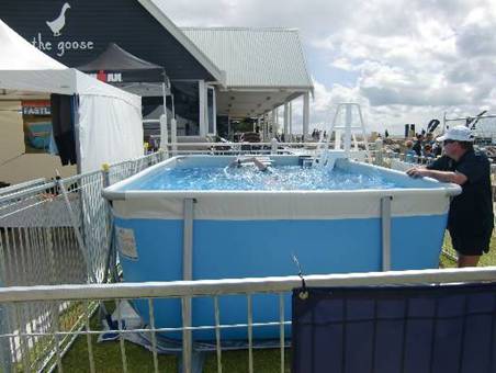 Gooseの隣はエキスポ。これが噂のエンドレスプール。ジェット水流に逆らって泳ぐ。豪邸でなくてもプールが置ける?