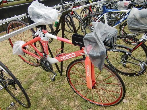バイクゴールゲートで 何度かにわか雨が降ったので、天候が落ち着くのを待ってバイク預託に行く。 マッキーの前輪のタイヤがなんとなくぺっちゃんこ。 「今空気を抜いたばかり。ちょっとだけ抜いたつもりなんだけど」 「しかしこんなにぺっちゃんこもおかしい。」 「いつからだ?」 「わからない。」 あわてて、係員に断わって、前ホイルをはずしてホテルに持ち帰り、バスタブに大急ぎで水を張って、パンクの水試験。 バルブの差込み口から気泡が少しずつ出てくる。やっぱり、持ち帰ってよかった。 タイヤの張替えを考えたがその前にバルブ差込口をペンチで増し締めしてみた。 気泡は出なくなった。 これでOK。 再びトランジッション会場に戻り、係員に説明して、再入場させてもらいホイールを着けて一見落着。 他、トランジッションバックバイク用とラン用を預けておわり。