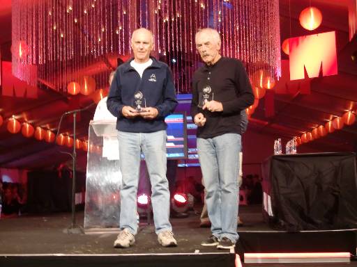 傾いて走っていたM70カテゴリのおじさん。向かって右側。翌日のアワードパーティで表彰された。このカテゴリは完走すれば入賞だ 西レッグが終わり、東レッグに行く。 1時間余しの目標は難しそうだ。 まあ、完走しよう。そして絶対に歩かないぞと誓う。 傾いたまま走っている人もいるのだ。 36km地点。 歩いて私を抜いていったやつがいた。 けっして珍しいことではないのだが、何かがはじけた。 筋肉が動かないならピッチを刻め。 あと6km。キロ8分なら目標の15時間台に間に合う。 この時点でキロ8分なんて到底無理。キロ10分が精一杯。 少しでも気を緩めると11分台に落ちる。 それが今の現実。しかし、スイッチが入った。 38キロ地点までの2キロをキロ8分で走れた。 ひょっとしたらいけるかも。 あとは暗くて時計が見えない。 ともかくラストスパート。 エイドも飛ばして走った。 40キロ地点。 この2kのラップはキロ9分に落ちていた。 16時間切りは無理だ。 しかし、いったん入ったスイッチはそのまま、キロ9分でゴールまで走りぬく。 今回赤浜氏製作(ハマックス)のシューズ中敷を履いていた。 この最後のスパートがかけられたのはこの中敷のおかげと思う。 足が前へ前へと出る。 土踏まずをサポートしてくれているので、脚の筋肉疲労が少ない。7時間に及ぶランでもまだ脚が残っていた。 (ちなみにこのインソールのお問い合わせは hamax-insole○docomo.ne.jp ○を@ に換えてください。 Fax 0138-46-5565です)。 クイーズ通りに出た。真昼のような照明。 花道の柵を囲むたくさんの人たち。 ハイタッチの手を差し伸べる。ここからは楽しもう。 ハイタッチをしながらゆっくりと進む。 梅澤さんと竹内さんがいた。 梅澤さんとハグをしてしまった。 ハイタッチと、割れるような拍手の中ゴール。 Fukashi Makimoto you are an ironman! おなじみのゴールコール。 いつ聴いても気分が良い。 とりわけ今回は、体力が落ちているのではないか? 不安の中、どこまでやれるかわからなかったのでうれしかった。 十分に余裕を持ったゴール。 アイアンマンを思い出としてではなく、今現在アイアンマンなのだという証を刻むことが出来た。 Run Time 槇本 美恵子 4:36:55 槇本 深 7:18:04 Overall 槇本 美恵子 13:41:52 カテゴリ 6位 総合 1013位 槇本 深 16:07:43 カテゴリ 14位 総合 1167位 アフターレース 宿に一度帰る。 マッキーは葛根湯を飲んで、風呂に浸かって温まったらすこし具合が良くなったようで一安心。 着替えてゴールに戻り、カウントダウンを見る。 最後の選手は16時間44分で、あのM70の傾いて走っていた選手らしかった。 その後ゴールはない。 梅澤さんと竹内さんを見つけて、一緒に盛り上がりの輪に入る。 ゴールでは、ボランティアがディスコダンスを踊って盛り上げている。 若い女の子だけではなく、リーダーの年配のおじさんも愉しそうに踊っている。 盛り上げようという意図で、無理して盛り上げているのではない。 心から楽しんで自然に盛り上がっている。 やがてカウントダウン。 あと300mくらいのところに一人いるらしい。 みんながゴールさせてやろうと叫ぶ。 ○○カモンと、声をそろえて叫ぶ。 しかし、時間が終わったところで、走るのをやめたらしくおわってしまった。 ゴールのにぎやかさ、盛り上がりはミニハワイコナ。 ワールドチャンピオンシップに勝るとも劣らない盛り上がりを見せていた。 コース途中の応援もチャンピオンシップに負けない。 町全体の盛り上がりも同様。 宿に帰り、シャワーを浴び、カップめんを食べて塩分を補い、VBビールの小瓶を一本キューっとあけて安らかに眠った。 12月6日月曜日 あさ5時頃目が覚めるがまた眠る。 朝食はしっかり食べることが出来た。ダメージは軽いようだ。 マッキーもすっかり元気になって一晩で風邪を治したようだ。 自転車とトランジッションバックを回収に行く。 9時になるのを待って、成績発表を見に行く。 マッキーはカテゴリ6位だった。1位はなんと11時間台。 もし、風邪を引かないで万全の体調だったとしても、ひとつ順位を上げて5位が精一杯だった。 十分にあきらめのつく、参りましたという成績だった。 最終ゴールがあの傾いた走りのM70カテゴリのおじさんだったことも確認。 なんとなくうれしくなった。 車椅子で走りきった人もいるが、あのおじさんは一般カテゴリで完走した。 車椅子で走りきった人と同等の価値があると思った。 自転車はそのままで、今度は交通機関として使って、気ままに街見物に走り回った。 去年のランコースの西レッグも懐かしんで見に行った。 昼はまたGooseに行って、同じメニューを食べる。 レースの疲れが癒える感じ。 オージービーフのたんぱく質が身体にしみこんでいく。 夕方大急ぎでバイクを分解して梱包。 アワードパーティだ。 エイジの表彰。 マッキーのライバル達の写真をしっかりと真近でとっておいた。 日本人では西口さんが5位入賞していた。