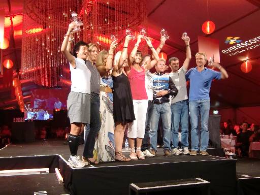 西口さん表彰台に登る。向かって左端 ワールドチャンピオンシップにも出たことがある人で、調子も悪くなくいい走りだったそうだ。 ハワイを狙ってきたと言い切っていた。 しかし、思いがけず大会のレベルが上がってしまった。 強豪が揃い踏みしてしまった。 表彰台に上がったことで少しにこやかになれて良かった。 M70の傾いた走りのおじさんもカテゴリ3位で表彰台に上がった。 最後に小島さんの表彰があった。 最大の拍手。 ステージを一周してお披露目。