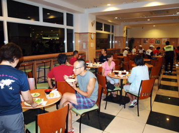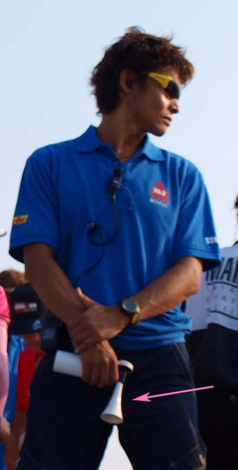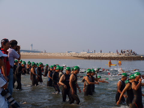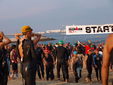 午前4時起床です!前夜寝たのは0時過ぎ。4時間弱の短めの睡眠でした。深〜い眠りから目を覚まします。 前回書き忘れましたが、JTBでの宿泊を手配した場合は大会当日の朝食サービスがあり、午前3時30分から食べることができます。 用意されていた食事は、おにぎりやパン、マカロニたっぷりのサラダや、ふかしイモなど(他にもなぜか冷しゃぶもありました)。 もちろんバイキングですので、好きなだけ食べられてとってもありがたいです。 食事の後、午前5時すぎ(一番早いバス)に、4人そろってホテル前からバスに乗りスタート地点の近くまで移動。(※応援者はあとでゆっくり無料シャトルバスで会場入りできます) バスを降りてからトランジッションエリアまでは少し距離があり、5分ちょっと歩くことになります。 ![]() トランジッションエリアに到着すると、まだ人はまばらな状態。 でもトランジッションエリア内にはバイクが整然と並べられており、これからレースが始まるぞ!という独特の空気感です。 海を見ると波はあまりありません。 スタート地点から海を見ると、左に空港へ続く大きな橋があります。ランの後半で渡る橋です。 ここで、「必ずこの橋を渡り切る!」と心に誓い深呼吸。一人で少しムードを演出してみました(笑) 自分のバイクのところに戻り、シューズやタオルなどをセッティング。 タイヤにも空気を入れます。今回のコースは路面が悪いことから、いつもより少し高めにしました。 【補足説明・・・前田】Nさんからのアドバイスだと悪路の場合はタイヤの空気圧は低めにセッティングしたほうが良いそうですまたボトルはエアロボトルを含めてトリプルで用意。 2つは水。残りの1つはエネルギージェル入りです。これにはザバスのピットインを4つ入れ、更に塩も入れ(3〜4g)、水を足しました。 したがって、結構、甘くてしょっぱい液体。 決して美味しくありません・・・。 でも練習中に色々試した結果、固形物が苦手な私は、この方法でエネルギーやミネラルを補給するのが適していると感じ用意しました。 今年は練習時も30℃を超える暑い日が多くありました。 100kmをバイクで走った場合には、私はトリプルボトルでも自宅に戻って体重を計ると2kg近く減少します。 脱水予防のために沢山の水を飲んでも低ナトリウム血症になる可能性もあるそうで、水分だけでなくミネラル補給も重要だと感じました。 軽いアップの後、更にエネルギーゼリーを1つと前日空港で買っておいたオハギを食べました。 ![]() そして更にここでも500ccくらいの約1%の食塩水を飲みます。これも暑さ対策で、練習で試し調子が良かったため実践しました。 その後、ウエットスーツを着て海へ。 海に入ると、北海道の冷たい水に慣れていることもあり、拍子抜けするくらいのぬるさです・・・。 大会側発表の水温は24.5℃でした。したがってスロットを目指している人でもウエットスーツは着用可です。 私はスロットなど全く関係がないですが、当然、ウエットスーツは着ますので、スイム中にそうとう汗をかくことを覚悟します。 試泳開始の時点で、試泳の残り時間はあと10分くらい。少し急いで最も沖にいる人のところまで泳ぎます。 泳いでみると水の透明度はあまり高くなく、比較的浅いところでも海底は全く見えません。 でも前を泳いでいる人の足は確認できました。 東川で前の人が全く見えない状態を経験していますので、足が見えるだけでも安心感があります。 泳いでみても、やはりコースは分かりにくい印象。 目印のためにヨットが停泊しており、ポールに吹き流しが付いていますが、吹き流しが凄く小さくて見えにくかったです。 やや不安も感じましたが、周りと一緒に泳げば良いと前向きに考えることに。 でもこれが後々甘かったと思い知るのですが・・・ 『スイム編』 今回は5グループに分けたウエーブでのスタート。 ![]() 第1ウエーブがエリートおよびエイジ34才以下、第2ウエーブがエイジ35−39才、第3ウエーブが40−44才、第4ウエーブが45-49才、第5ウエーブ50才以上です。 第1ウエーブが7時30分にスタート。その後、5分ごとにスタートとなります。 したがって38才の私は第2ウエーブで7時35分のスタートでした。 試泳を終えて陸にあがりスタートを待っているとMAEさんやヒロコさんが私を見つけて話しかけてきてくれました。 去年参加した長崎は、フローティングでのスタートでしたので、陸からのスタートはまた違った雰囲気です。 話をしながら、まったりと待つのも何か心地よい時間でした。 その後、ウエーブごとに纏められ、スタートを待っていましたが、隣の人が私にコースについて尋ねてきます。 自信がない中、私なりに「まずあのヨットを目指し、その横のブイを右で、その後は更に右に向かってあのヨットを目指すはず・・・」などと 説明。 その後、周りの人たちも加わり、それぞれの考えを話します。 でも皆、やや認識が違っているようで、やはり自信がない様子。 その中で「と
