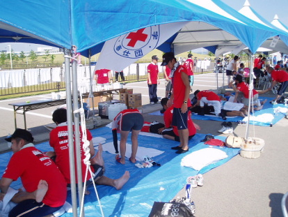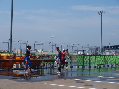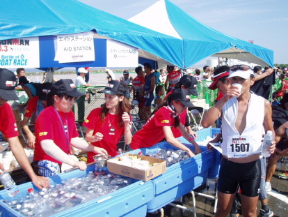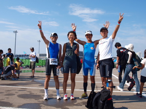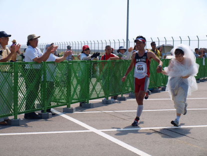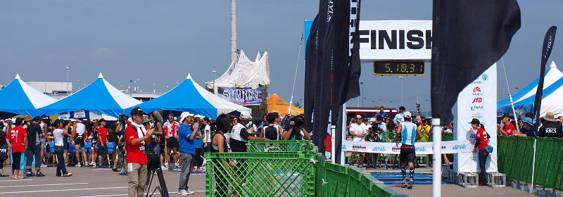 バイクをラックに戻し、メット脱ぎ、キャップを履いて、ランニングシューズをかぶります。 さー出発です。 てっ・・・できるか〜!! 失礼。間違えました。キャップをかぶり、ランニングシューズを履きます。 トランジットは早い方ではありませんが、今回はまあまあスムーズにできました。 走りだす前に息を整えるため、大きく深呼吸。 トランジットエリアを出てすぐ、バイクで戻ってきたMAEさんとすれ違いました。 MAEさんとのタイム差はトランジットの時間を考えても5分ちょっとくらい。 いずれ間違いなく追いつかれます。でも「少しでも先で」との思いで走ります。 走り出してみると以外に足が軽く感じました。いつものバイクの後は足が動きだすまで1kmくらいは我慢の走りなのですが、今回は比較的足が動いています。 バイクの時に違和感があった右太ももの裏側も今のところ大丈夫そうです。 ランコースはまず北へ1キロほど走り、折り返して海岸沿いを南に1キロくらい走ります。 コースには1kmごとに距離表示があります。1km地点で目標だった5分30秒ペースで走ることができていました。 この海岸線を南に走る場所は右の海が青く見えて景色が良かったです。 ここは応援の人も大勢いて、沢山声をかけてもらい元気が出ました。 海岸線を抜けたあとは工場地帯のようなところに入ります。 と言っても工場などはあまり無く、空き地の多い北海道で言えば石狩湾新港や苫小牧の苫東地区と似たような場所です。 この中は道路が広く片側2車線(合計4車線)くらいあり、その広い道路をコーンなどで複数(4本以上のところもあります)のコースに仕切りっています。 つまり自分の横のコースには折り返してきた逆向きの人がいて、その更に隣のコースには自分と同じ方向に走る(何キロも先行した)人がいるといった状態になります。 レース後、「迷路」と表現した人がいましたが、まさに迷路の中を走るようなコースでした。 それでもコーンが沢山設置されていて、ボランティアスタッフも一定間隔で沢山いますので、ミスコースをするリスクは低いと感じました。距離表示により自分の走っている位置も判ります。 3km地点くらいで脇腹が痛くなりました。ペースを少し落としてみますがあまり痛みは変わりません。 そのままの状態でエイドに到着。水を飲んでスタートしようとすると、柄杓(ひしやく)で水をかけているボランティアがいます。 2〜3人順番を待っていましたが、私もその列に並び、自分の順番がきたら「お願いします!」と頭を出しました。 「バシャ−!」と頭から水をかけてもらいます。 すっごい勢いでした。まるでひょうきん族のザンゲ?のようにびしょ濡れです。 しかも「冷たい!」本当に冷たかったです。びっくりしました。でもすごく気持ちよかった。 再び走り始めると、横っ腹の痛みが急に無くなり、不思議なくらいすっきりしています(ザンゲして良かった☆) このお陰でペースも少し戻すことが出来ました。 この頃からMAEさんと度々すれ違いはじめます。 始めは「1kmくらい差があるかな?」と思いましたが、すれ違うたびに距離が縮まってきます。 何とか抜かれるのは少しでも先にしたいと思いながら走ります。 3キロ地点付近から15キロ地点付近までは、先ほどの工場地帯の中をグルグルと走ります。 景色があまりにも変化がないので少し辛くなってきます。でも時々MAEさんとすれ違うので刺激になりました。 10キロ手前くらいで、右大腿の裏側に痛みが出始め、攣りそうな気配を感じます。 ここでピットイン1本とミネラル入りのソルトを補給しておきました。 エイドは1.5km〜2kmごとにありますが、その全てに寄り、コーラを飲むようにしました。 11キロ付近でMAEさんに追いつかれました。 一声かけて頂いた後、MAEさんは私の前を一定ペースで走ってくれました。 私もMAEさんに着いて行こうと思いペースアップを心がけますが、やはりペースは上がりません。 MAEさんは少し走った後、「行くよ」と声をかけて少しペースアップ。 私は逆にペースが落ちてしまい、見る見る差が広がっていきました。 MAEさんに追われている間は緊張感があり、5分30〜45秒/kmくらいを何とか保っていましたが、一旦抜かれてしまうと一気に気が弛んでしまいます。 11km地点で時計を見たときにはスタートから4時間50分くらいでした。残りは約10km。 平均6分/kmペースで走れれば目標の6時間には間に合います。 しかしMAEさんに抜かれてから緊張の糸が切れてしまいました。気を抜くとスピードがガクンと落ちます。ラップを見ても6分を越えています。 15km地点に空港への連絡橋の入り口があるのですが、11km地点からここまでの数キロが一番辛く感じました。 また連絡橋の入口には短いですが少しきつめの坂があります。 なるべくスピードが落ちないように意識し、足を前に出します。右太股も違和感から痛みに変わってきています。 周りの人も苦しそうです。 スタート前に「この橋を渡る」と誓いました。ここで心