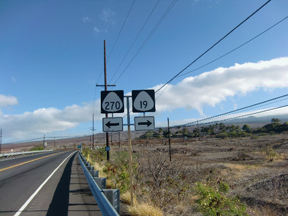 もうすぐ分かれ道。クイーンK(19号)が終わり、ハビ行き(270号)とワイメア行き(19号)の標識。 ハビまであと19マイルとの標識。