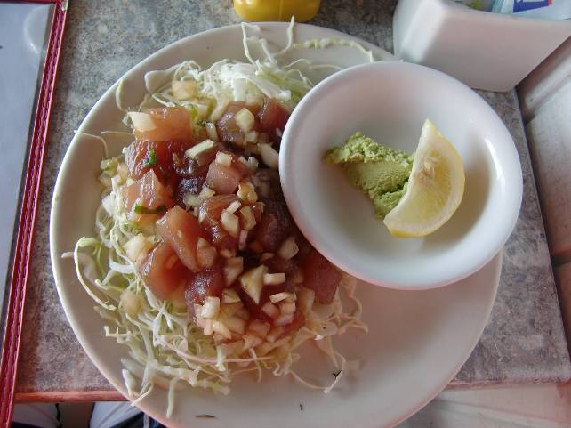 ポキです。 カツオを醤油で浸けて、オニオンでまぶし、 山盛りのキャベツに盛りつける。 シンプルだが、これ以上ビールをうまく飲める肴はないだろう。 炎天下で飲むビールは、あっという間に汗腺濾過されて酔うことはない。