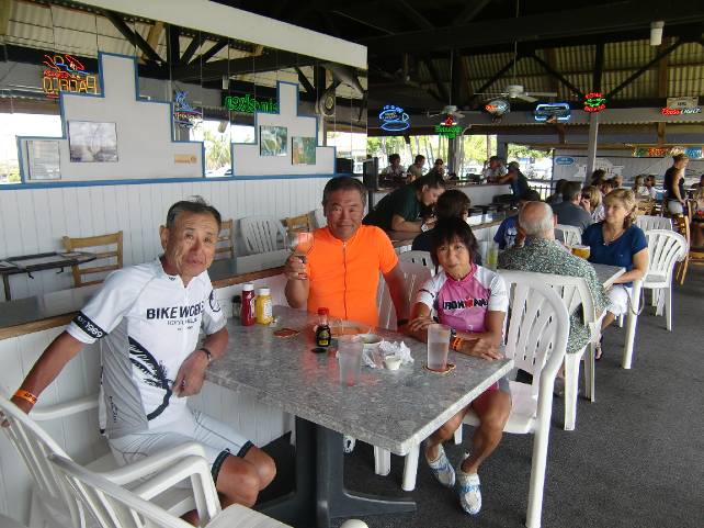 アリドライブを500mくらい歩いて流れ解散。 そのまま日本料理店のビストロ横浜に行く。 私と冨田さんはすきやきを マッキーは卵納豆豆腐などを食べた。 レース前日の腹ごしらえと、朝の弁当を予約する。 すきやきがボリュームたっぷりで、二人で55ドルと安かったが、味はたれなどもよく吟味されており、美味であった。 10月10日水曜日 バイク遠乗りのつもりであったが、膝が痛い。飛行機で長時間座り続けて、靱帯が鬱血して軽い炎症を起こしている。今日は無理できない。選手ではないので気は楽だ。 今日はスイムに徹することにした。 朝食後、アイアンマンの3.8kmを試泳した。 海は豊穣で色とりどりの熱帯魚が泳いでいて目を楽しませてくれる。 クラゲの子供のような、プランクトンのような、小さな浮遊生物が無数に雲のように浮いている。どうやら無害な代物らしい。 これが魚たちを養っているのだろう。 安全でさえあれば、安心感さえあれば大いに楽しめる海だ。 しかし、 風は沖から陸へ。接岸流。風が強くうねりが大きい。 体が大きく上下しながら泳ぐ。 ブイがよく見えない。そのため、たびたび蛇行する。 遠くの目標を見て、なるべくまっすぐに泳ぐように努力する。 かなり沖にでた。選手は試泳しても、あまり遠くまで行かないで折り返す。 だれもこんな沖まできていない。 少しは遠くまで泳ぐ人もいるのだろうが、波がうねっていて、ブイも人も見えない。 岸の方を見ると、サーファーが喜びそうな大波がたってザーッと大きな音をたてている。 ひょっとして時化て来たので海水浴場は閉鎖になり自分だけが沖に取り残されたのでは? 小魚の半径十メートルに及ぶ巨大な群に会う。 海が真っ黒になるような群だ。 こういうときは巨大な魚が群を追っているのでは。 むれの真ん中からジョーズが突然飛び出てこないか? 小魚でも、ピラニアみたいに凶暴な奴で、骨しか残らないほど食われるのでは? 毒を持った海蛇が突然海底から浮上して襲ってこないか? 心細さに伴い、いろんな空想が浮かんで恐怖する。 ブイが見えた。 やっと着いた。 ブイに捕まり目を凝らす。 250mくらい先にまだブイが見える。 もうイヤだ、引き返そう。 しかし、ここまで来て、完泳しなければ後悔する。 行くべし。 気持ちが揺れ動く。 膝が痛くてバイクの試走予定がだめかも。 そしたらせめてスイムだけでも。 心細い気持ちと恐怖を振り払って、次のブイへ泳ぎ着く。 もう1時間を越えている。 間違えないここが折り返しか? しかし、まだ先にブイがある。 もうやけくそだ、ジョーズでも海蛇でも、ピラニアもどきでも何でも来るなら来やがれ。 次のブイに到着。 つかまって何度も何度も確認。 もうない。やっと本当の折り返しだ。 さあ引き返そう。 1時間10分経過。 倍すると、アイアンマンのスイム制限時間である2時間20分ぎりぎりになる。 しかし帰りは接岸流で少し早いはず。 あい変わらず、うねりの谷間に時々しかブイが見えない。 しかし、不思議なもので帰りはまったく心細さや恐怖は感じない。 蛇行しながら次々と帰りのブイをクリア。 桟橋が見えたときは、うるうるとなった。 指先が砂浜にふれたとき、よく恐怖に打ち勝ち完泳できたと喜びがこみ上げた。 2時間12分。制限時間まであと8分。 こういう日もあるのだ。 私の泳力なら、普通穏やかな海であれば、ウェットスーツなしでも1時間45分くらいでスイムアップできる。 これはマッキーにはとても言えない。 風が強いときの海は全く別物。 天候によってはマッキーがスイムアップ出来ないかもしれないことを内心覚悟した。 休み休み、ゆっくり泳いだことにしてマッキーには感想を伝えた。 昼食後、大西さんのバイクメンテを受ける。