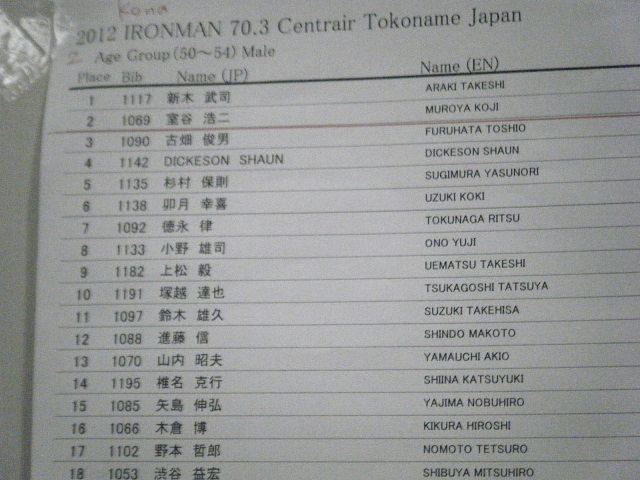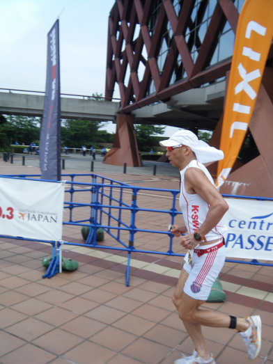 相変わらずレース前夜は眠れない。 トランジットのイメージを繰り返しているうちに、寝付くタイミングを失ってしまった。 IRONMAN70.3JAPANという、ビッグなレースではあるが、全国のトライアスロン仲間との「トレーニング成果発表会」的に考えているので緊張感はない。筈。 コナやラスベガスのスロットなどを考えるレベルではない。 朝方、うつらうつらと一時間ほど眠れただろうか? エイジ7位 ロールダウンでラスベガスGET!の、夢を見た(笑) 4:00 起床 ある程度身支度を整えてから、ホテルの朝食会場へ 選手のあまりに旺盛な食欲は想定外(笑)なのか、おにぎり類が間に合わない。 軽く、パンとバナナを食べ部屋に戻り、もしかしたら…と、用意しておいたコンビニ食でエネルギー充填 完了! 5:30 チーム仲間と会場へ バイクの再点検、補給類のセット、トランジットバッグのセッティングやナンバリングを終え、早めにスイム会場へ。 徒歩で30分近くかかった… Swim 1.9km プロカテゴリーのスタートは7:30 ウェーブは10分間隔でスタートする。 S藤さんは第4ウェーブ。Iちゃんは第5、自分が第6、I岡さん、Fうさん、A浜さんが第7、MッキーとH子ちゃんが第8ウェーブだ。 今回のレースには安田大サーカスの団長も出場していた。 バイク好きは有名ではあるが、トライアスロンをやっているとは知らなかった。 カメラマンや音声さんなどのスタッフも一緒なので、番組にもなるのだろう。 カメラに向かって、「ほなイッテくるで〜!」と、テンション高ッ! 前のウェーブがスタートしてから100mほど沖のスタートエリアまで泳ぐ。 水温は23℃ほどで、適温と言ってよいだろう。 ただ、前の人の足がようやく見えるくらいの透明度しかない。 フローティングのまま待機していると追い潮のため流された。 スイムが苦手な自分には追い風ともいえる。 スタートリストでは169名だったが、ずいぶんバラケているように見えたので、最前列で待機する。 「プァ〜!」と、エアホーンが鳴りスタート。 「さぁ 楽しもう!」 ウェーブスタートって良いですねぇ バトルは殆ど無し、時折足を触られる程度。 すぐに自分のペースで泳ぐことができた。 キックは殆ど打たない。バランスを取るだけ。 触られたときにけん制するくらいだ。 トランジットも距離が長いし、何よりバイクに脚を残したい。 進行方向の大きなブイを見つけるためヘッドアップして今更ながら気が付いた。 同カテゴリーのスイムキャップがブイと全く同じ黄色だった。 ブイ間は3〜400mあり、一度ではなかなか見つけられない。 途中、自分を追い抜く選手。 フォームも綺麗で自分より泳力が上なのはあきらかだ。 ピタリ後ろにつくと付いていけそうだった。 しかし、ヘッドアップするごとに少しずつ離れていく。 「彼を信用して付いていけは良かったかな?」 次回のレースに生かそう! ほぼ3回に一度ヘッドアップしたので大きな蛇行はなかったと思う。 スイムフィニッシュのアーチ型バルーンが見えたときはホッとした。 スイムアップして時計を見て驚いた。 「29分台?」追い潮でワンウェイなので、タイムが良くなるとは思ってはいたが、ここまでとは思わなかった。 時計が止まっていないか確認したくらいだ。 ゴーグル、キャップ、上ウェットを脱ぎながらT1バッグを取りに走る。 バッグには大きな花を付けておいた。「おぉ 目立っている」 バッグをピックアップして更衣室へ スムーズにセット完了! 寝付けないくらいくり返したイメージ通り!(笑) バイクまで300m以上?走る、走る。走れる。スイム後の身体の重さを感じない。 市民プールで、スイムとプールサイドランのメニューを繰り返した成果かな? バイクの前でシューズを履き、乗車位置まで。 本来ならば、バイクにシューズをセットしたかったが、今回は不可だった。 スイム 29:07 T1 4:00 ![]() バイクコースの序盤は海岸沿いで平坦だが、狭くてトリッキーだ。 防波堤のような所を多く通る。 継ぎ目や段差が多く、その都度、脚を止め、腰を上げ、リム打ちパンクには気を付けた。 軒下をかすめるような狭い道を過ぎ15km地点で一般道へ出た。 「これでようやく給水、補給ができる」 給水はポカリスェット、BCAA,クエン酸、塩少々の混合1.5リットル。 補給食は、クリフバー2 ザバスピットイン3 20kmを過ぎた辺り、前ウェーブでスタートしたIちゃんに追いついた。 「Sさん、10番手位!」 「エェ〜 そんなに上位なの?」 バイクでは何十人もパスしていないし、スイムでそれほど上位とは考えられないので、トランジットが良かったのかな? 平坦な所で、後ろから「グゥオー!」と、同カテゴリーの選手たちにパスされた。 自分のスピード表示でも42,3km/h出ている。 アッという間に見えなくなった。「これがハワイに行く人達のスピードなんだな」と、間近に見れて嬉しくも思った。 コースは内陸部に入ると、小さなアップダウンの連続だった。 狭いクランクカーブの右左折、下ってスピードが出たところを減速し、Uターンして登