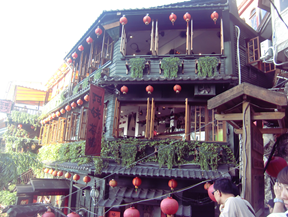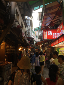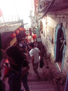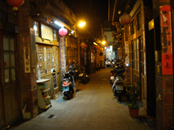 台湾の娘さんが窓から顔をだして妖艶に微笑み、売れっ子の遊女になったつもりになって楽しんでいる。 私高いわよ。ほーっほほほ。といった感じ。 ここは大金持ちがおおくバブリーだったので、遊郭とはいえ悲惨さはなかったようだ。女性陣に行ってみて窓から顔を出してみろ。と提案したが断られた。 すこし遠目でソフトフォーカスで写真をとればいいショットになったのにと思う。四国の金毘羅さんのような街並が続く。