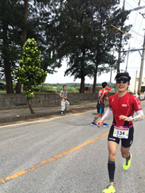 折り返しまでは何とかたどりつき、このペースで行けるかなと思ったのですが。練習では20k以上走っていなかったこともあってか、急に25kを過ぎたところから脚が動かなくなりました。 もう記録なんかどうでもよくなりました。そして今回が9回目のロングになりますが初めてランの途中に心が折れて歩きました。 一度歩くと、もう駄目ですね。 何度も歩いては走っての繰り返しとなり、歩いた後に走り出すのがとてもつらいことが分かりました。 毎回エイドでは冷却とレモン、オレンジ、コーラをもらい何とかつなぎました。 そんなとき御年64歳のハコトラ富田さんとすれ違い、元気にハイタッチしてくれました。 すごい人だ、無事ゴールしてくれればいいなあと願いつつ、ちょっと元気もらいました。 くよくよして歩いていると、抜いていく選手も声をかけてくれたり、“ゴールしたらおいしいビール飲めるね”とか励ましてもらいながらラスト5kまで来ました。 しかしここからも長い。走れない。やっぱりトライアスロンはある程度しっかり練習しないとレースはつらいだけになってしまい、集中力もなくなっていやになってしまう。 もうやめよう。 今日ゴールしたらしばらくトライアスロンはやめよう。 歩いても制限時間には入れるから完走はできる。でも次はないと思いながら歩みを進めていきました。 どんどん抜かれていきます。 全然気になりません。 なんとか競技場にたどり着きました。 やっと終わる・・・。 以前に同じ職場にいた仲間が一緒にトラックをゆっくり走ってくれて、ゴール近くで妻も合流してなんとか無事ゴールテープを切ることができました。 完全に出し切りました。今のベストと思います。 記録はワーストでしたが、最も記憶に残るレースでした。
