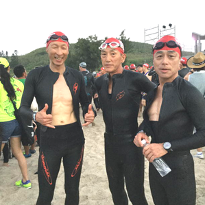 スイムスタートを待つ、杉さん、奈良さん、シンちゃん。 容赦なく快晴の空。 湿度高く空気は重くじっとりと湿った感じ。 予報では34度、湿度87%、体感温度47度。 と伝えていた。 水温は24.3度でウェットスーツOKと昨日決定されていた。 プロが男女別に時間差でスタート。 一般参加エージグループの選手たちは大まかに、自主的にスイムが早い順に並ぶ。 1時間10分以内、1時間10分~41分、1時間41分以上。 と三つにグループ分けするプラカードを持ったボランティアが並ぶ。 タマ(槇本美恵子、マッキー)も真ん中のグループ一番後ろに並ぶ。 私も真ん中のグループ後半に並ぶ。 タマは相性の良い師匠の個人レッスンに巡り合えた。 そのおかげで長年のスイム伸び悩みから脱して、ようやく泳ぎが一皮むけてきつつあるところ。 私の9割くらいのスピードになってきた。 去年は後ろのほうに並び、平泳ぎに囲まれてひどい目にあったので、今年は背伸びしてもう少し前に並んだ。 昨日の試泳の時は、強い西風に伴う潮流があったが、今は朝凪。ほとんど無風で潮流もなさそう。 スタートホーンが鳴る。 8人ずつ3~5秒間隔でウェーブスタート。 スタート直後にセンサーワイアが貼ってあり、 そこを通過した時点で個人ごとのタイマーが始動する。 制限時間もすべてここから個人ごとに始動。焦らなくてもよい。 マラソン大会では遅い人ほど後ろに並ばされ、制限時間や関門はスタートロスタイムと無関係に号砲から。 これは制限時間が気になる遅い人にはとてつもないプレッシャー。 殺気立って前に行こうとする。将棋倒しの事故が起きかねない。 陸連も何とか固い頭を改めてほしいものです。 などと考えているうちに自分の順番が来た。 砂浜を30m位走って入水。波は少ない。 腰まで歩いたら泳ぎ始める。 台風の後だった昨年とは違い、水は透明。きれいな砂浜。 魚は見えない。貝やカニの巣穴らしきものが時々見える。 気分よく泳ぐ。丘の上は湿熱地獄だが、水の中は気持ちよい。 日の出だ。 左顔挙で目に入りまぶしい。右顔挙げに代える。 こちら側はあまりなれていないので蛇行気味。 ヘッドアップを頻回にして方向を確認。 ウェーブスタートながら、周りには人がいっぱい。 ゴーグルの上を叩かれる。ゴーグルの位置が微妙にずれるも、何度か瞬きや口を開け閉め顔の筋肉を動かすと 蛇行して人にぶつからない様、注意を払って泳ぐ。 ぶつかったりしたら何をされるかわからない。 今年はバイクショーツだけを中に履いて、袖なしのウェットスーツ。 涼しくて腕がよく回る。 猛暑の時は袖つきウェットスーツは暑くてたまらない。 気分よく泳ぐ。 1周回目、丘に上がるとケコちゃんが応援してくれる。元気をもらい2周回へ。 相変わらず周りに人が絶えない。折り合いをつけつつ慎重に泳ぐ。 ドラフティングターゲットを探すが、どうも安定した泳ぎ手が見つからない。 潮流があるのか、沖のブイが岸よりに流され、岸側の最終コーナーブイと沖側の折り返しブイとが紛らわしい。 危うく最終コーナーブイに向かうところだった。 立ち泳ぎで折り返しブイがまだ遠くにあることを確認正しいコースを泳ぐことができた。それ以外は気分よく泳げた。 泳ぎ終え丘に上がる。