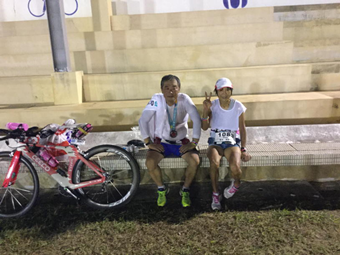 杉村さん夫妻。完走おめでとう タマはやらかした。と明るくいってます。 けっしてしょげてはいませんから気遣い無用です。 またどこかでとってくるでしょう。 スイムがバトルに巻き込まれながらも自己ベストを出せたのが大きな収穫。 私は、ジャパン2回完走して以来、一昨年最後のジャパンと去年の台湾いずれもタイムアウトでDNF。 3年目にしてようやく完走できました。 もう年なのかとモチベーションが落ちかけていましたが、2001年のマレーシア以来、猛暑で完走できました。 17年前と同じことができてまだまだやれると一安心。 ひと時、甘味な勝利の美酒に酔っています。 ラン 7:05:26 7位 総合 16:53:29 7位 Koji,Akahama 01:12:16 06:10:59 04:03:22 11:36:56